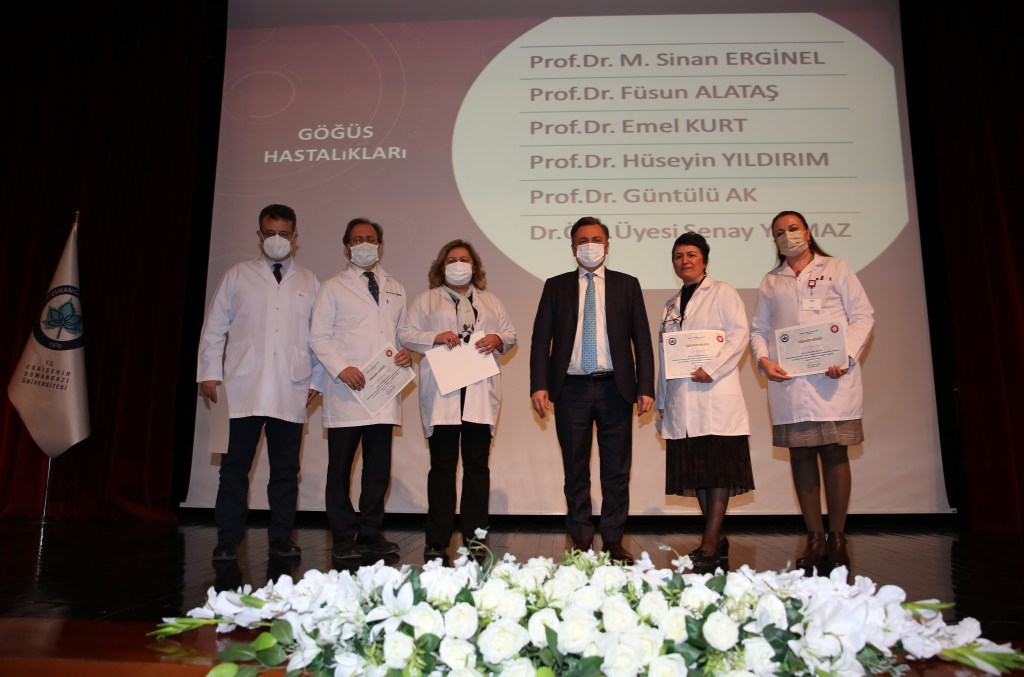 Stajer doktor Yağmur Kaygusuz ile Araştırma Görevlisi Dr. Adem Erdoğan’ın konuşmalarının ardından tören, Tıp Fakültesi Dekan Yardımcısı Prof. Dr. Cavit Can’ın yönettiği teşekkür belgesi sunumu ile devam etti. ESOGÜ Rektörü Prof. Dr. Kemal Şenocak, ESOGÜ Rektör Yardımcısı Prof. Dr. Ali Arslantaş ile ESOGÜ Tıp Fakültesi Dekanı Prof. Dr. İ. Özkan Alataş COVID-19 sürecinde gece gündüz çalışarak üstün performans gösterip özveriyle çalışan hekim ve asistan doktorlara teşekkür belgesi takdim etti.