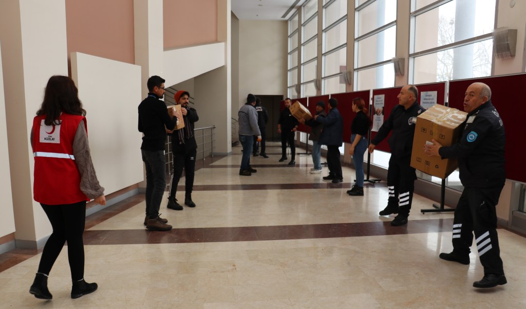 Bunlardan ilki Üniversitemiz Kongre ve Kültür Merkezinde ayni yardım toplama masaları oluşturmak oldu. Web sitesi, sosyal medya hesapları, personel elektronik postaları ve SMS yoluyla duyurulan ihtiyaç listesi önceliğine göre toplanan malzemeler gönüllü ESOGÜ çalışanlarınca ayrıştırılıp yardım kamyonuna yüklenerek afet bölgesine ulaştırılması amacıyla Türk Kızılayı Eskişehir Şubesine gönderilmeye başlandı. Kan ihtiyacına ilişkin de toplu duyuru sistemi kullanılarak personel ve öğrenciler Türk Kızılayı Eskişehir Şubesine yönlendirildi.