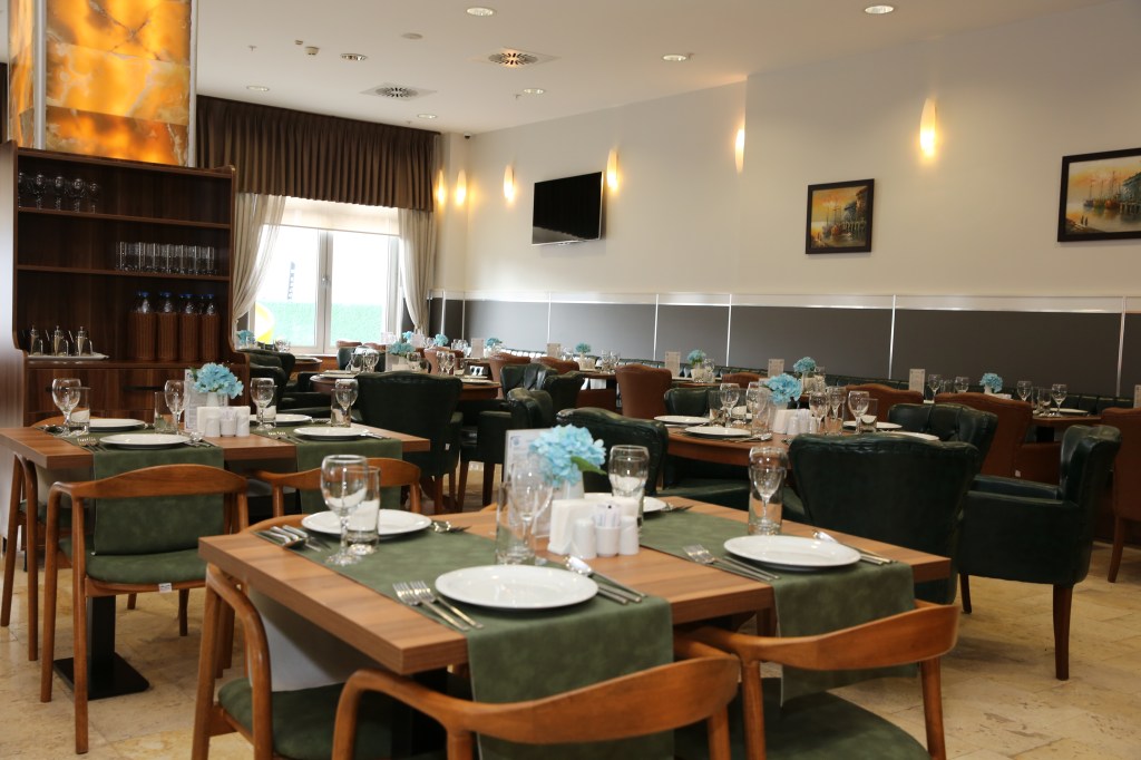 104 kişilik restoran salonu ile 30 kişilik VIP salonuna sahip restoran yemekli toplantılara da ev sahipliği yapabilecek.